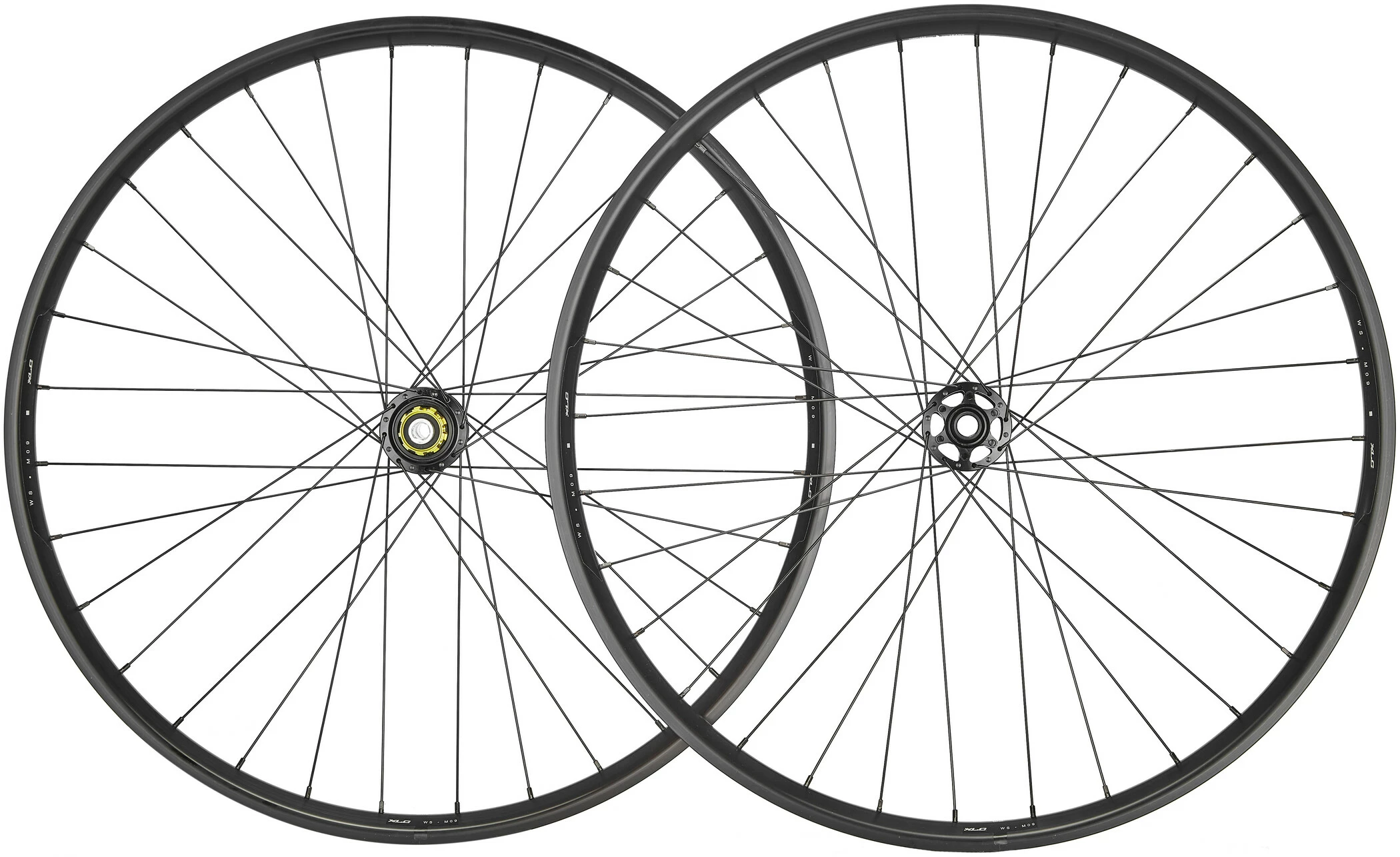 XLC E-MTB-hjulsættet 29″ WS-M09 leveres med standardfregnav til Shimano og SRAM (8,9,10,11-speed). Stikakslen er 110 x 15/148 x 12 mm. Navene er CNC-bearbejdet smedet aluminium for at opnå bedre ydeevne og mindre vægt. Forhjulet vejer 1027 g, baghjulet 1245 g.